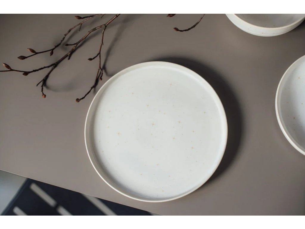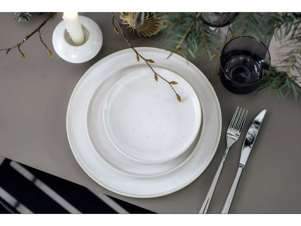 Porcelánový talíř z kolekce Winter Glow je zdoben speciální efektní glazurou, která mu dodává jedinečný zimní vzhled. Zlaté hvězdy a jemné detaily připomínají poklidnou zasněženou krajinu, díky čemuž je každý kus originálem.