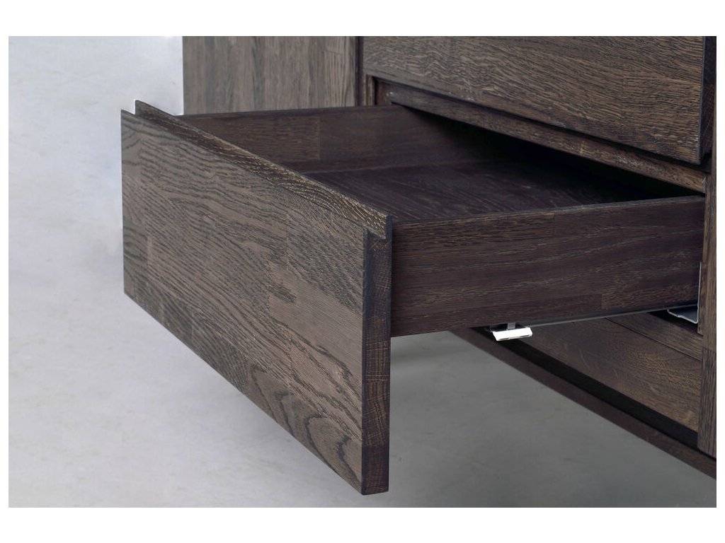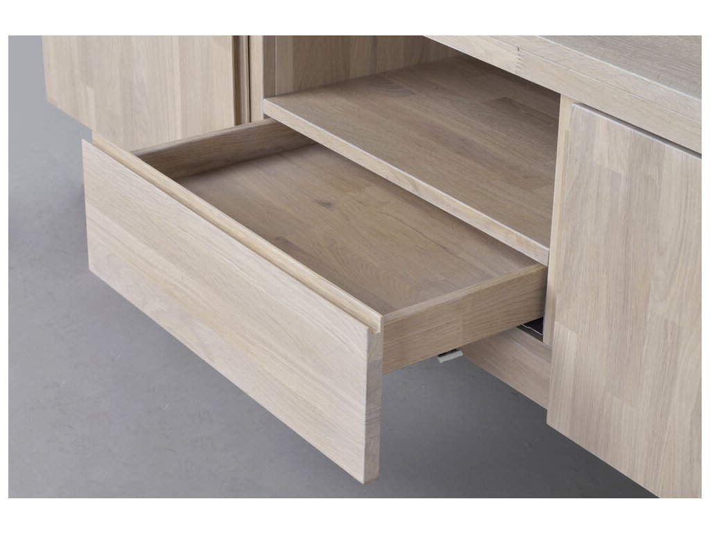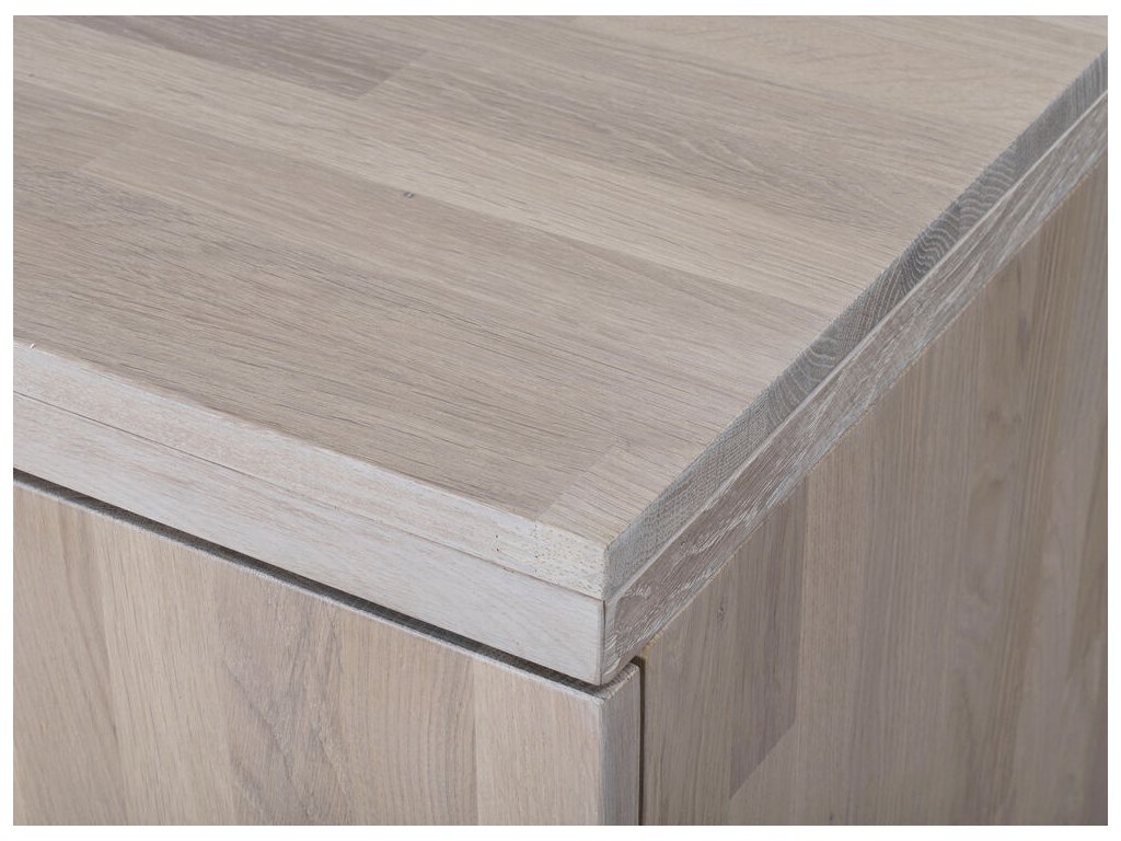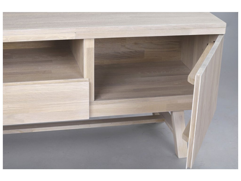 Stolek je vyroben z masivního dubu s prstovými spoji (finger joint), které zajišťují vysokou pevnost i estetický vzhled. Povrch je pečlivě kartáčovaný, aby vynikla přirozená struktura dřeva. Zásuvky a dvířka s tichým dovíráním (soft close) přispívají k pohodlnému používání, zatímco praktický otvor pro vedení kabelů udržuje pořádek v prostoru kolem televize.