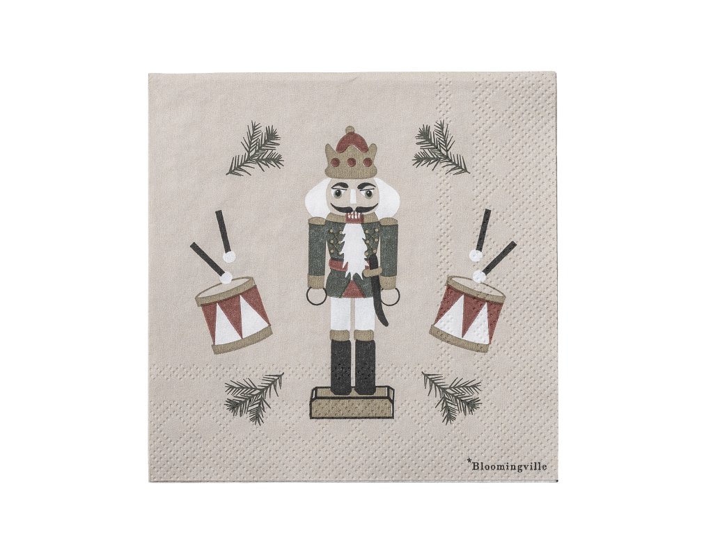 Ubrousky Jolly od Bloomingville dodají každému prostírání útulný a atmosférický nádech. Ubrousky mají motiv louskáčka. Jsou vyrobeny z papíru s certifikací FSC a každé balení obsahuje 20 ubrousků.Doplňkové parametry