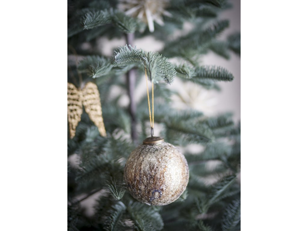 Vánoční ozdoba Nany od Bloomingville je skleněná koule s hrou kovových a teplých tónů, zavěšená na jemné zlaté niti.