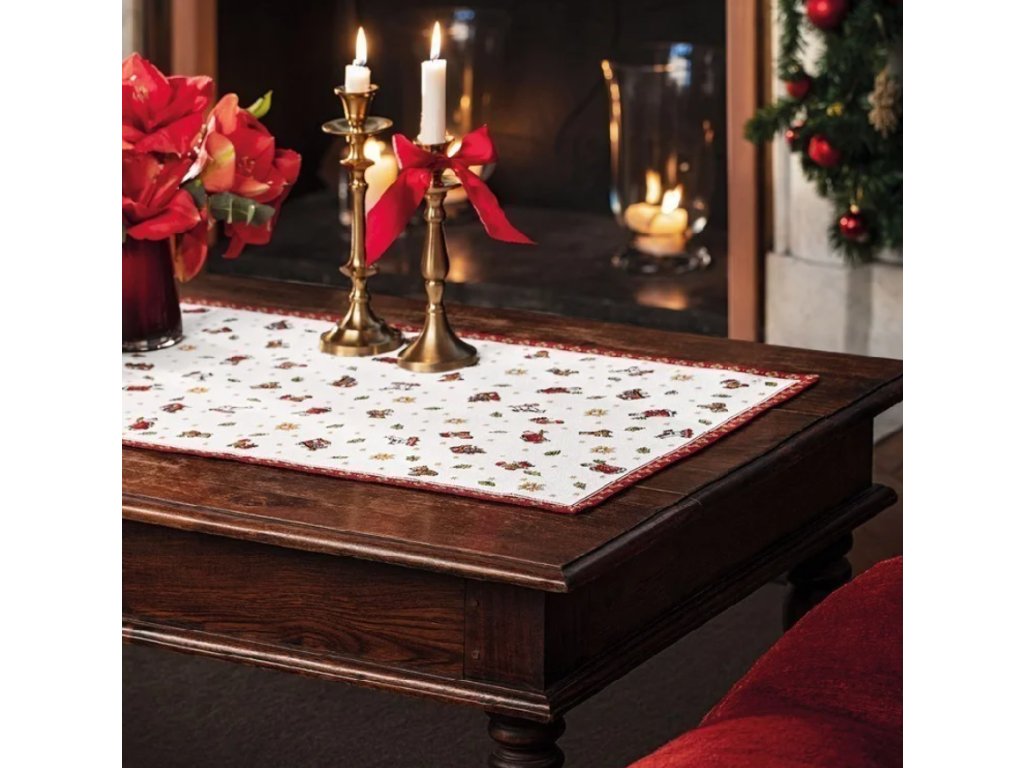 Velký vánoční gobelínový běhoun s propracovanými motivy v červené, bílé a zelené barvě dodá vašemu stolu nostalgické kouzlo. Je ideální pro větší tabule nebo jako dekorativní prvek na komodu či jídelní stůl.