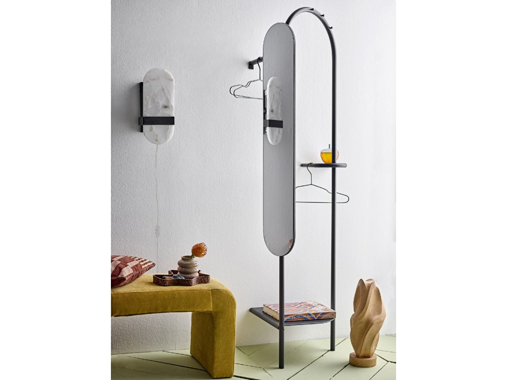 Věšák na oblečení Belen od Bloomingville nabízí jednoduché úložné řešení do předsíně. Věšák je vybaven nastavitelným zrcadlem, praktickými háčky na svrchní oblečení a poličkou na různé drobnosti. Jeho grafický a minimalistický design z něj činí všestranný doplněk do moderních i tradičních prostor. Nastavitelné zrcadlo a další úložné možnosti ho činí praktickým a funkčním pro malé i velké místnosti. Díky prostoru pro ramínka je věšák ideální i pro přivítání hostů v domácnosti.Doplňkové parametry