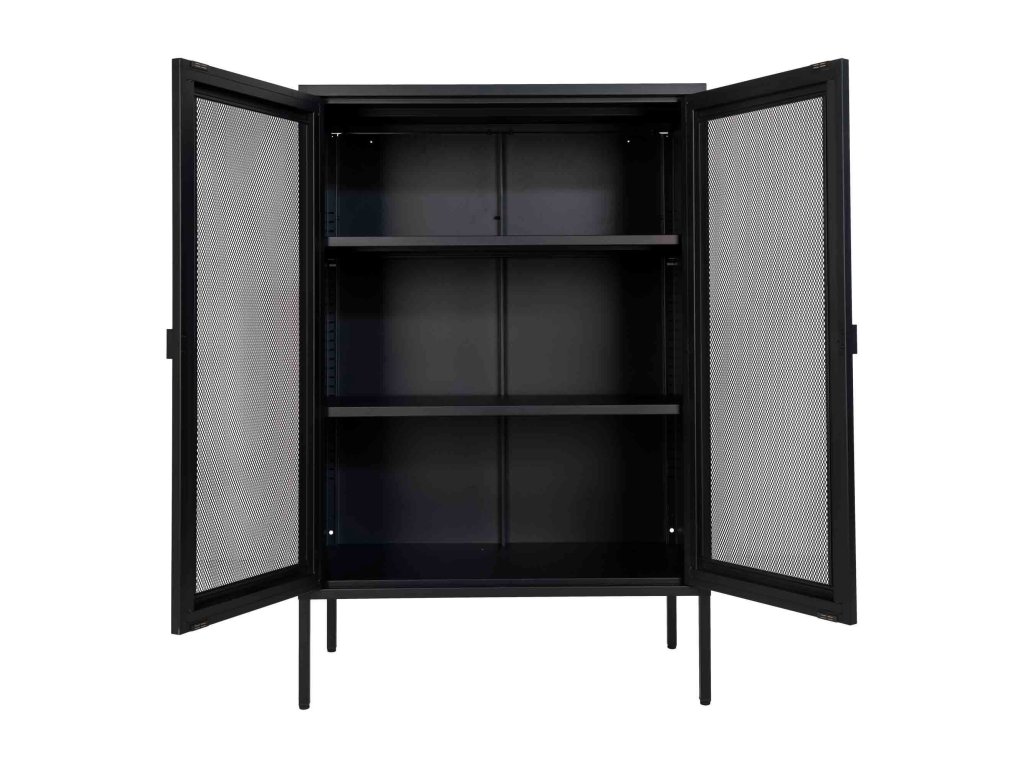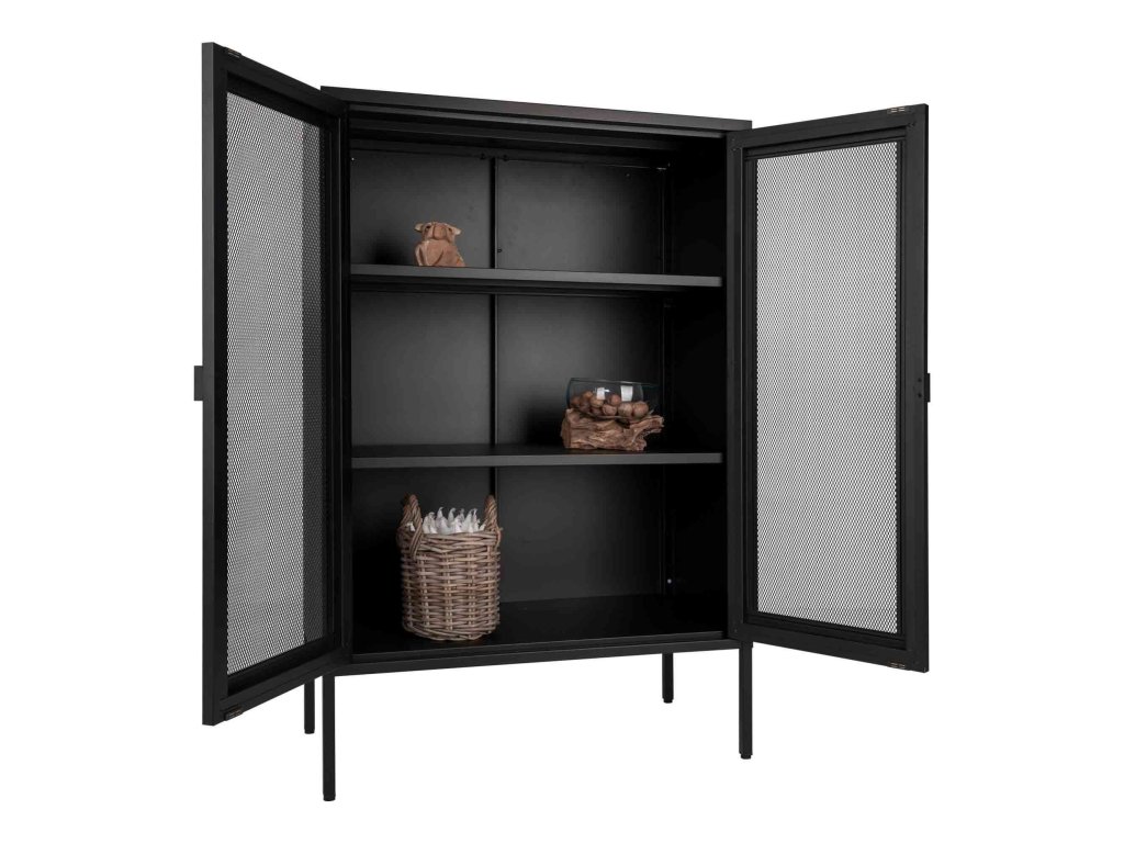 Tato elegantní černá kovová vitrína je dokonalým spojením moderního designu a vysoké funkčnosti. Je vyrobena z pevných kovových profilů, které jí dodávají robustnost a odolnost proti opotřebení, zatímco černá povrchová úprava jí propůjčuje sofistikovaný a univerzální vzhled. Vitrína je vybavena skleněnými dveřmi, které nejen umožňují perfektní prezentaci uložených předmětů, ale i chrání vaše cennosti před prachem a nečistotami. Interiér je vybaven policemi, jež je možné individuálně nastavovat dle potřeb.