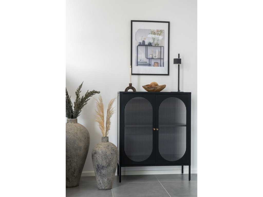 Tato kompaktní, ale vizuálně výrazná vitrína zaujme svým jednoduchým, avšak elegantním designem. Kontrolované skleněné dveře umožňují perfektní prezentaci uložených předmětů. Kovová konstrukce je pevná a odolná, zatímco tmavá povrchová úprava dodává nádech sofistikovanosti a univerzálnosti, vhodné do různých stylů interiéru.