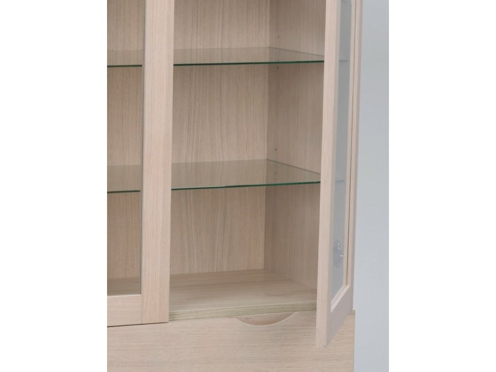 Vitrína je vyrobena z MDF desky s dubovou dýhou a má nohy z masivního lakovaného dubu. Je vybavena zásuvkami a dvířky s tichým dovíráním (soft close) a nastavitelnými policemi z tvrzeného skla, které umožňují přehledné vystavení dekorací, skla či porcelánu.