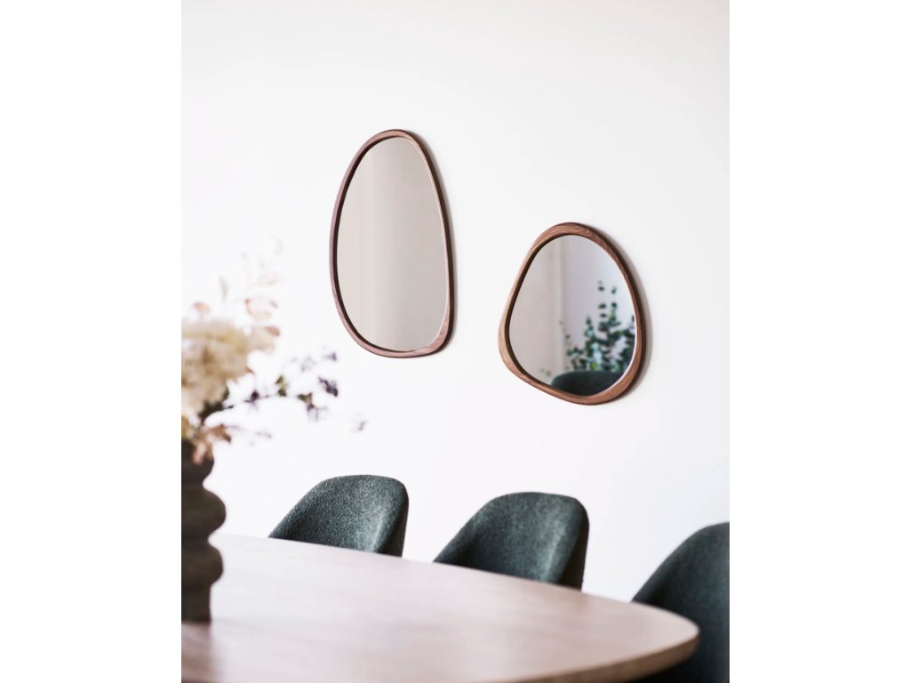 Dřevěné zrcadlo na zeď s organickým tvarem o rozměrech 44x48 cm, Luxon, nabízí přirozený a elegantní vzhled, vhodný do ložnic, koupelen nebo obývacích pokojů. Ideální pro vytvoření vzhledu s přírodním nádechem, přidává prostoru teplo a texturu, zvlášť vhodné do rustikálních, boho nebo skandinávských interiérů.