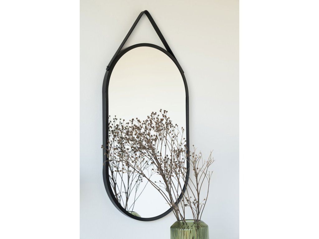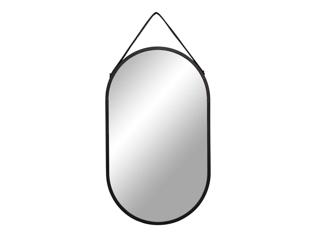 Ovalné závěsné zrcadlo, ocel/umělá kůže, černé, 35x60 cm, Trapani