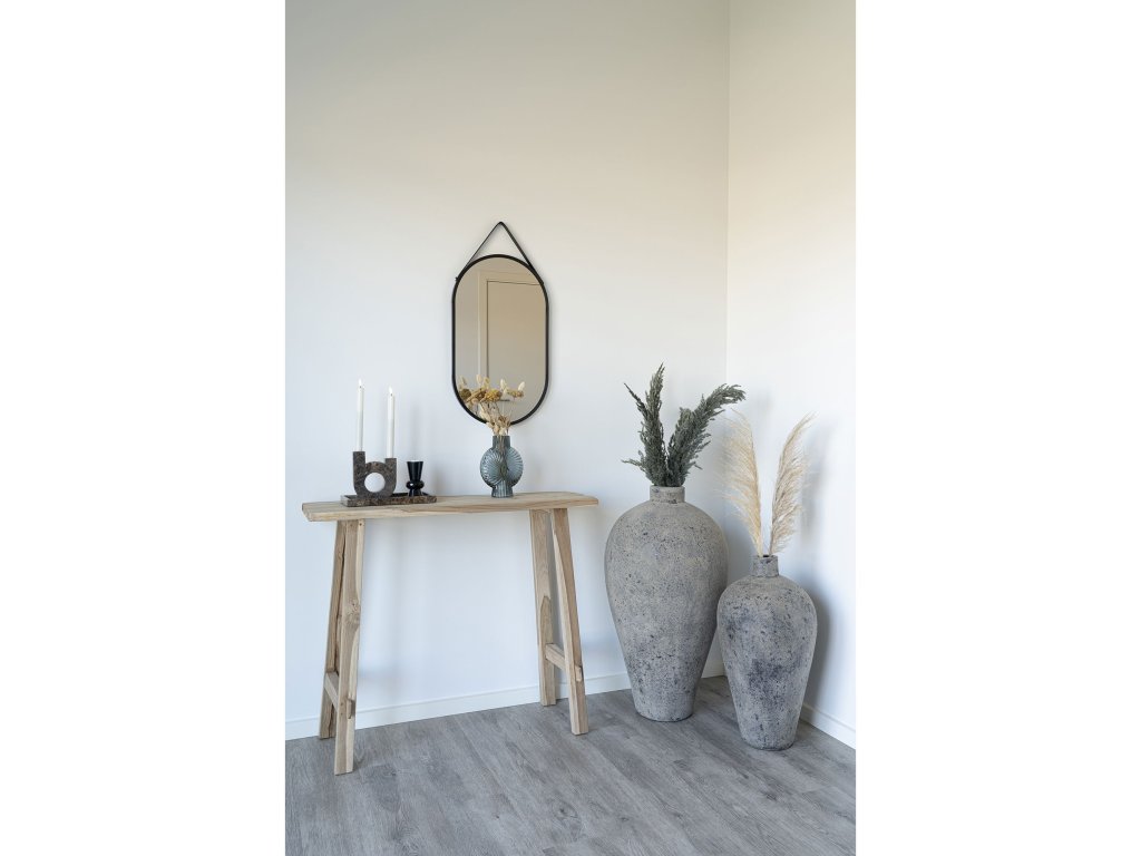 Ovalné závěsné zrcadlo s ocelovým rámem a prvky z umělé kůže Trapani nabízí výraznějším a zvětšeným tvarem vhodnou alternativu. Skvěle doplní moderní a industriální prostředí, například v koupelnách, šatnách nebo vstupních halách, a zároveň přidá sofistikovanost a texturu.