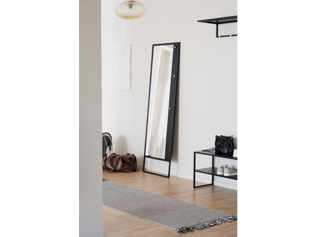 Stojací zrcadlo Malone 53×170 cm v černém kovovém provedení se zlatými úchytkami je stylovým a funkčním doplňkem moderní předsíně či ložnice. Je vyrobeno z kovu s práškovým lakováním v jemné pískové struktuře, která dodává povrchu elegantní matný vzhled.